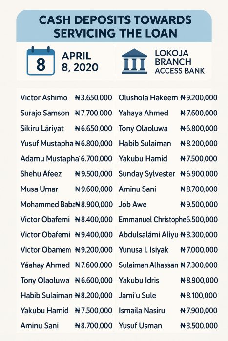 Abubakar further told the court that on April 8, 2020, multiple cash deposits were made at the Lokoja Branch of Access Bank towards servicing the loan. He listed the deposits as follows:
