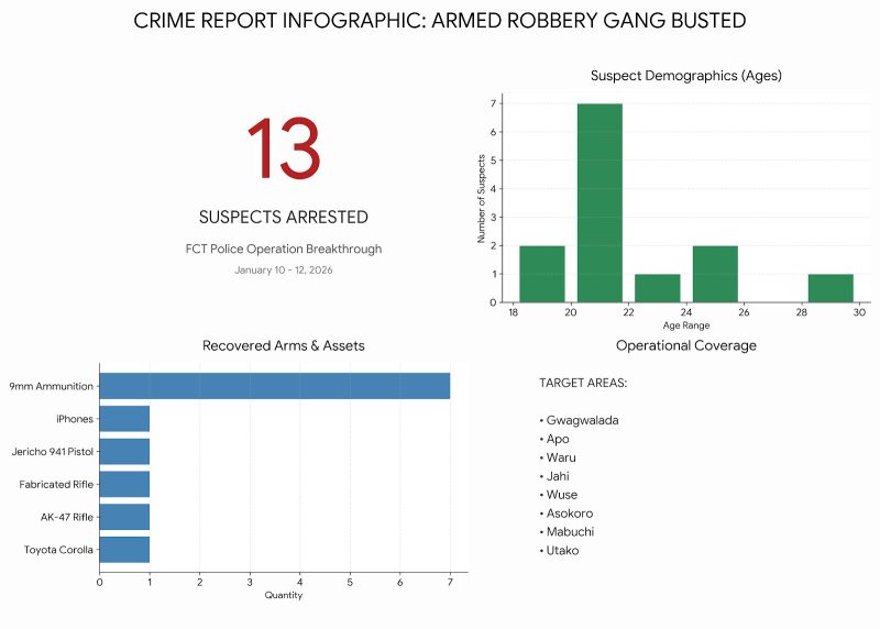 The Federal Capital Territory Police Command has announced a significant breakthrough in its fight against violent crime following the arrest of thirteen members of a notorious armed robbery syndicate.