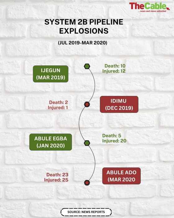 Within eight months before the Abule-Ado incident, three other explosions were recorded at Ijegun (July 2019), Idimu (December 2019), and Abule Egba (January 2020) — all along the System 2B. These incidents claimed at least 40 lives.