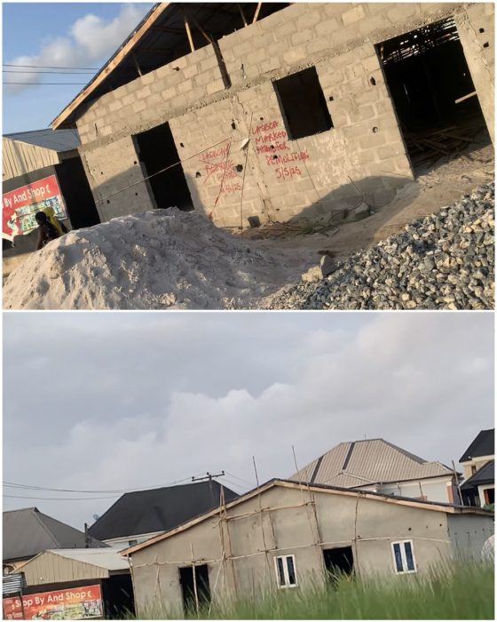 Along the ROW were some shops marked for demolition in May by LASBCA. A month later, instead of the expected demolition, construction work continued and the structures were plastered and nearing completion.