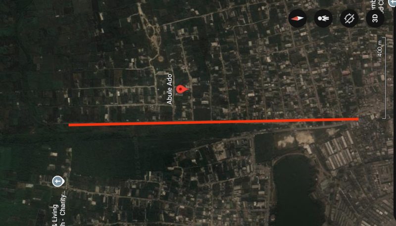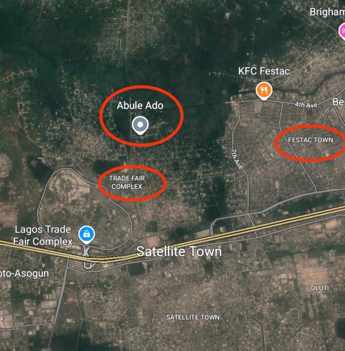 Google aerial view showing Abule-Ado’s dense population Aerial view showing Abule-Ado’s proximity to FESTAC and Trade Fair Complex (Source: Google)