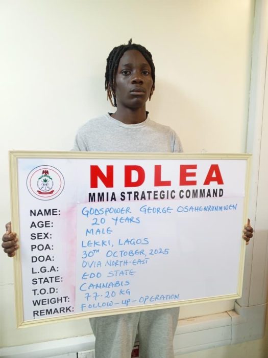 A music artist, Godspower George Osahenrumwe, whose stage name is Steady Boy, was on Thursday 30th October arrested by NDLEA operatives while attempting to take delivery of a large consignment of Loud, a strain of cannabis concealed inside three cartons of bathtub imported along with other items such as cloths and gadgets from New York, United States. This followed the seizure of the shipment, which arrived at the import shed of the Murtala Mohammed International Airport (MMIA), Ikeja, Lagos, from the US aboard a DHL flight on Tuesday, 28th October.