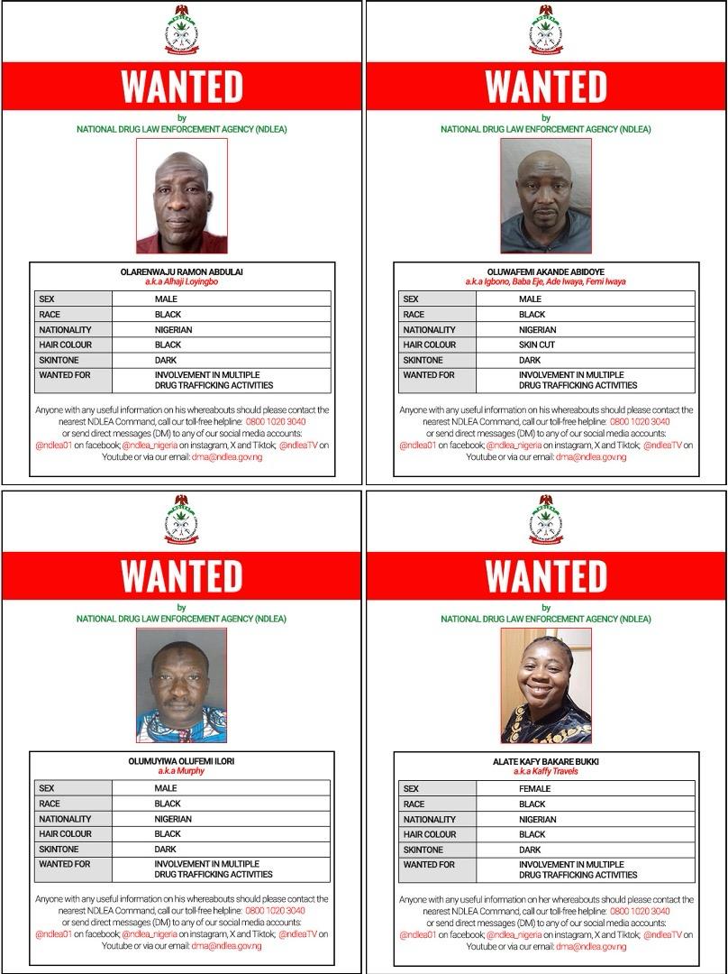 The decision to declare the suspects wanted followed an order granted to the NDLEA by Honourable Justice Akintayo Aluko of the Federal High Court in Lagos. Those wanted for their involvement in multiple drug trafficking activities include: Olarenwaju Ramon Abdulai (a.k.a Alhaji Loyingbo); Oluwafemi Akande Abidoye (a.k.a Igbono, Baba Eje, Ade Iwaya, Femi Iwaya); Olumuyiwa Olufemi Ilori (a.k.a Murphy) and Alate Kafy Bakare Bukki of Kaffy Travels.