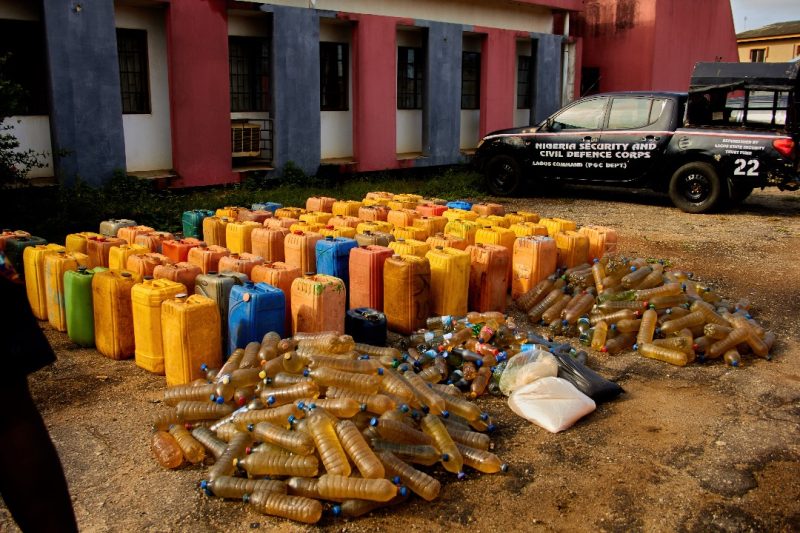 The Nigeria Security and Civil Defence Corps (NSCDC), Lagos State Command, Badagry Division, during a routine surveillance and patrol, on Monday, 26th May, 2025, at about 04:50am raided the hideouts of some suspected vandals and recovered illegal products found in kegs, sacks and plastic containers.