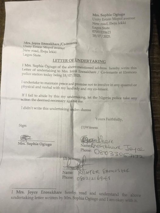 Responding to the allegations made against her, Mrs Enosakhare recounted: “ The sexual harassment allegation in my compound occurred between May and June. At the time, I had informed the tenants that I would be travelling outside Lagos. One night, I received a distressing call from Sophia, a tenant and fellow native of mine. Screaming over the phone, she said, Richard wants to rape her.