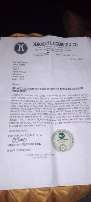 On Tuesday, Mrs. Enosakhare’s lawyer delivered a quit notice to Ogiugo. “I was asked to leave within the next 10 days,” she said.
