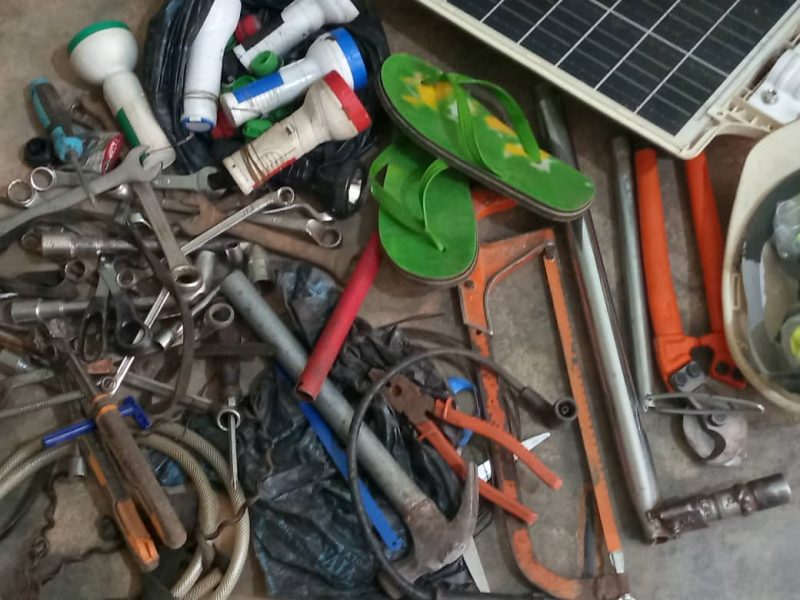 Upon searching the vehicle, police recovered several items suspected to be tools used for vandalism. These included digging bars, a hacksaw, scissors, a hammer, a cutter, a solar panel, spanners, battery head covers, a helmet and shirt, a wire cutter, screwdrivers, and multiple touch lights.